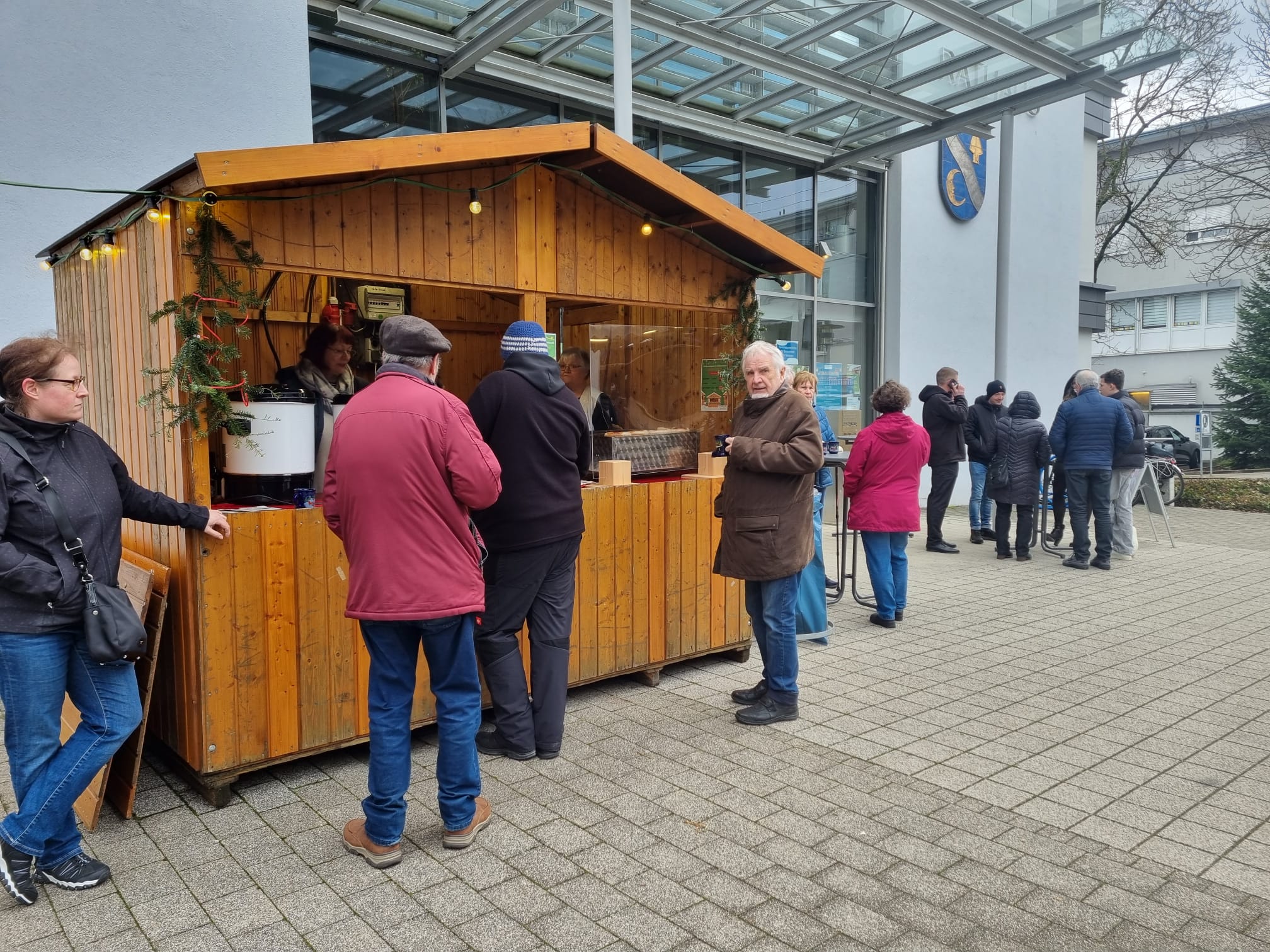 Mit diesem Motto lud die Gemeinde gemeinsam mit dem Kinderhaus Rosa Maria Honduras e.V. an jedem Freitag im Advent zu einer leckeren Bratwurst mit einem heißen Glühwein oder alkoholfreien Punsch vors Rathaus ein. Diese schöne Tradition wurde auch im Advent 2024 von den Waldbronnern sehr gerne angenommen und so waren alle 5 Termine der Glühweinhütte immer gut besucht. Besonders am Donnerstagabend beim „Lebendigen Adventskalender“ der Kolpingfamilie Busenbach vor dem Rathaus konnten zahlreiche Besucher bewirtet werden, während Thorsten Stalf das 12. Türchen öffnete.